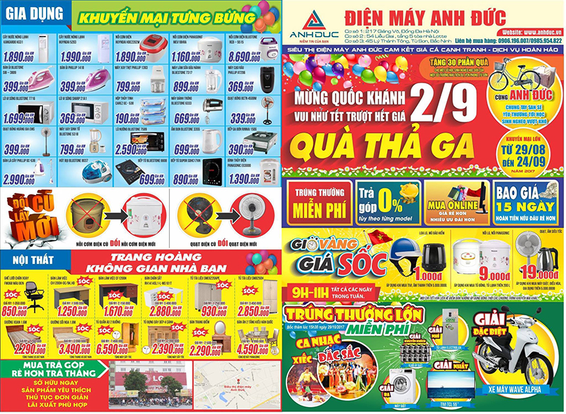 - Showroom của siêu thị điện máy Anh Đức được đặt ở 45 Lý Thánh Tông, Từ Sơn, Bắc Ninh với rất nhiều các sản phẩm được trưng bày và sử dụng thử giúp khách hàng có cái nhìn chân thực nhất về các loại sản phẩm, trải nghiệm thực tế để đưa ra quyết định lựa chọn sản phẩm hay không. Mẫu catalog tiêu biểu của siêu thị Điện Máy Anh Đức